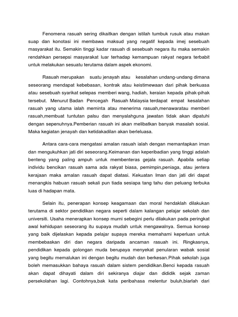 Rasuah merupakan wabak sosial yang mestilah dibanteras hingga ke. Menekankan bahaya rasuah dalam sistem pendidikan. Punca Gejala Rasuah dan Langkah Mengatasi.